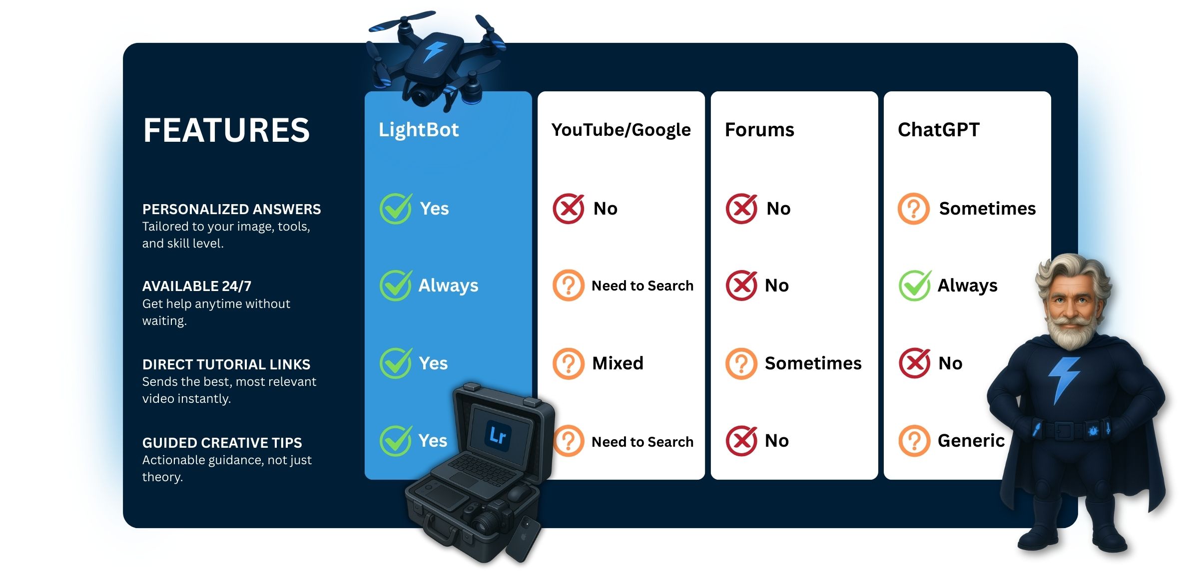 Built for photographers of all levels, LightBot combines the power of AI with years of real-world Lightroom Classic experience to give you the most helpful, human-like support whenever you need it.