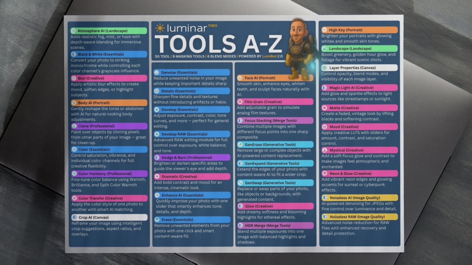 Get instant access to a beautifully simple PDF that explains every Luminar NEO tool from A to Z, plus bonus tips on blend modes and masking to help you edit faster and with confidence.