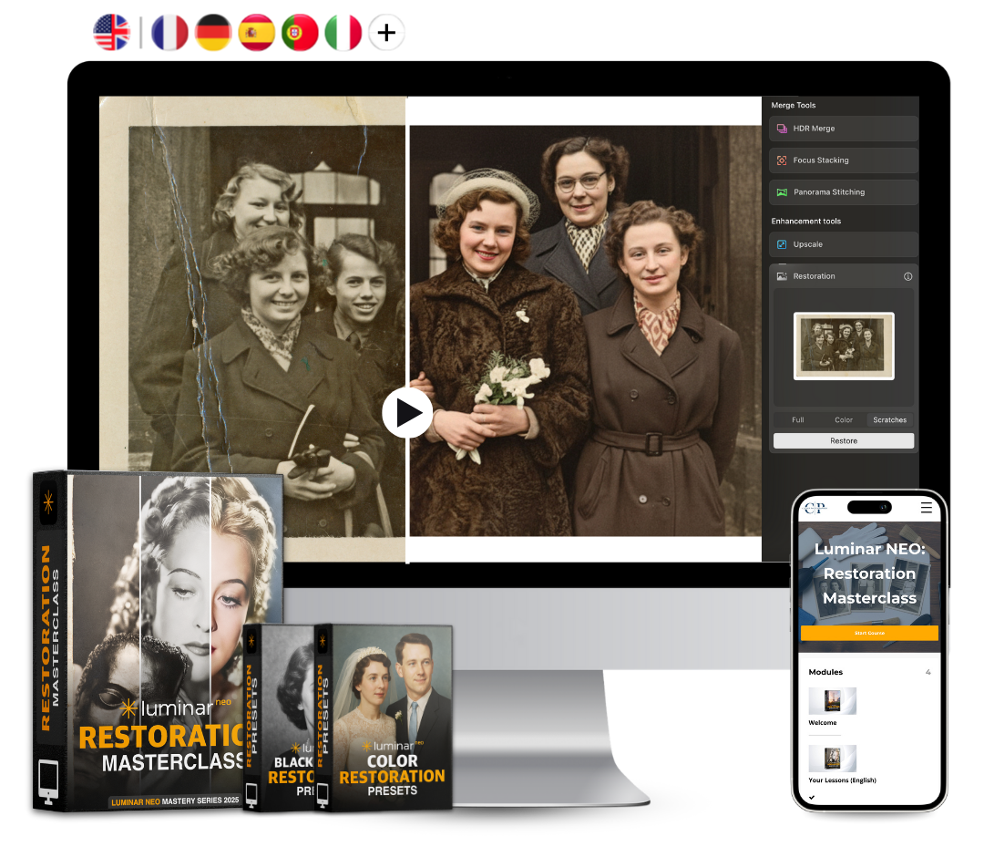 Across 15 focused classes and more than 3 hours of 4K video training, you’ll learn the full restoration process, from scanning and cleaning photos to fixing fading, recovering details, and applying natural colourisation. You’ll also explore how to combine the Restoration Tool with Luminar NEO’s creative and AI tools for truly professional results.